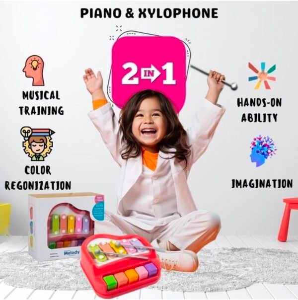 Introduce your little one to the magical world of music with the KidWiz 2-in-1 Piano Xylophone Musical Toy. This versatile instrument combines a colourful eight-key piano and xylophone, making it an engaging educational toy for toddlers and young children. The multi-coloured keys not only attract attention but also help in colour recognition and early musical development. Coming with two sturdy playing sticks, this instrument allows children to explore different ways of creating melodies – they can tap the xylophone or play it like a piano. The simple yet effective design helps develop hand-eye coordination, fine motor skills, and musical awareness in young minds. Perfect for both individual play and interactive music sessions, this musical toy brings together learning and entertainment in one delightful package. The compact size makes it ideal for both home use and on-the-go musical adventures.