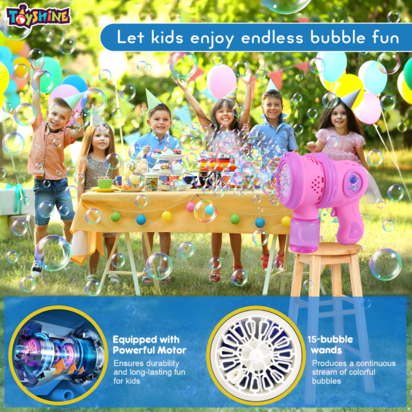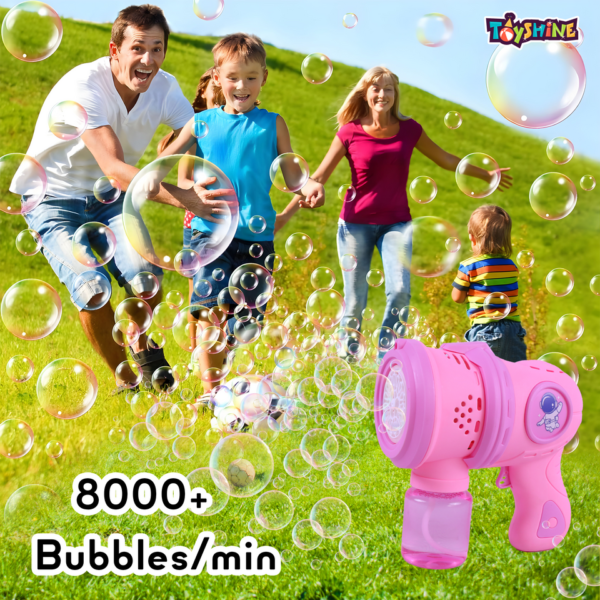Light up the sky with a stream of bubbles! Our Rechargeable Pink Bubble Gun is designed for maximum fun and minimal mess. With its easy-to-pull trigger and high-output 8-hole design, it?s the perfect accessory for birthday parties, picnics, and backyard play.1